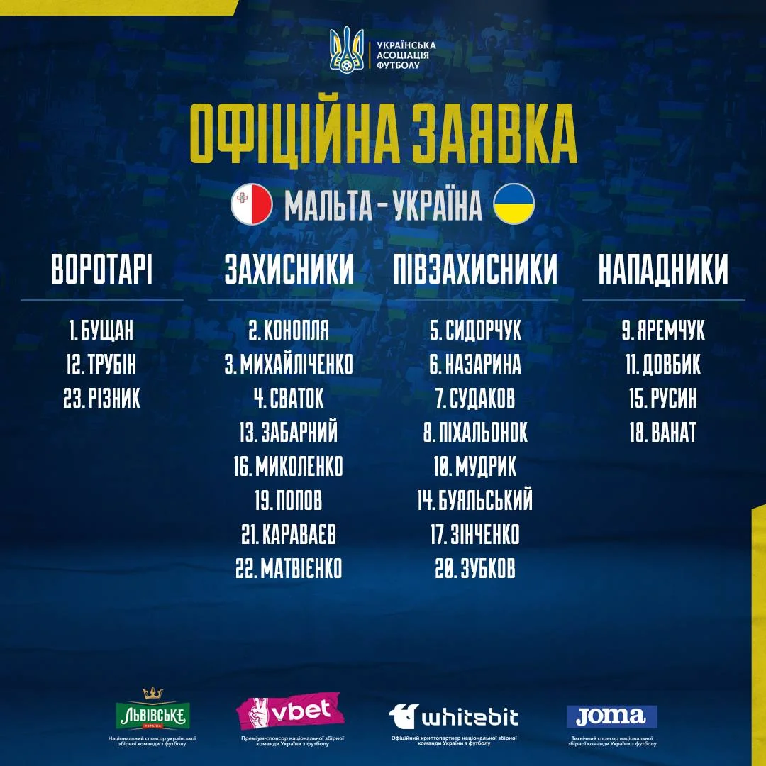 Заявка сборной Украины на матч с Мальтой: