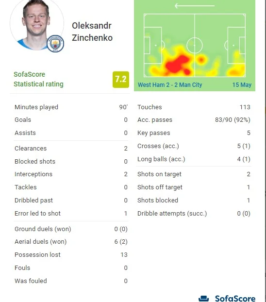 С первых минут обращала на себя внимание высокая позиция украинского универсала. Обычно так глубоко во владения чужого голкипера забегает Канселу. Смелый рывок на 110 секунде матча задал ему тон. Аномальным было и количество ударов – целых 4 попытки. Никогда за время своей карьеры в Манчестер Сити Зинченко не брал на себя столько. Раньше только раз было больше 2 выстрелов за матч АПЛ (трижды пытался поразить ворота Брайтона почти 4 года назад).