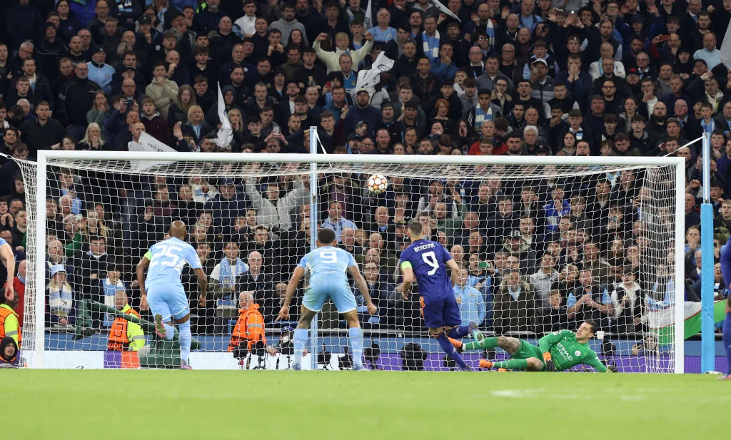 Арбитр Иштван Ковач без колебаний назначил пенальти. Карим Бензема в матче против Осасуны на выходных не забил с "отметки" дважды подряд – впрочем, здесь он не подвел столицу Испании. Француз исполнил "паненку", а Эдерсон улетел в угол. 4:3!