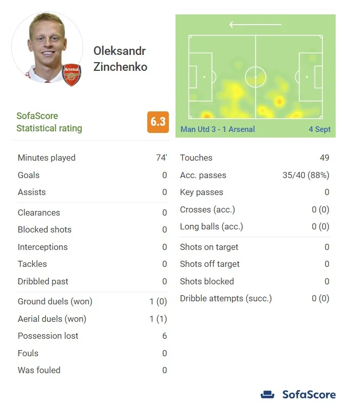 Что касается игры с мячом: украинец традиционно смещался в центр для розыгрышей и становился дополнительным центрхавом во время позиционных атак. Отдал несколько передач в штрафную МЮ и помог организовать давление в середине первого тайма, когда именно левый фланг Арсенала генерировал наибольшую остроту.
