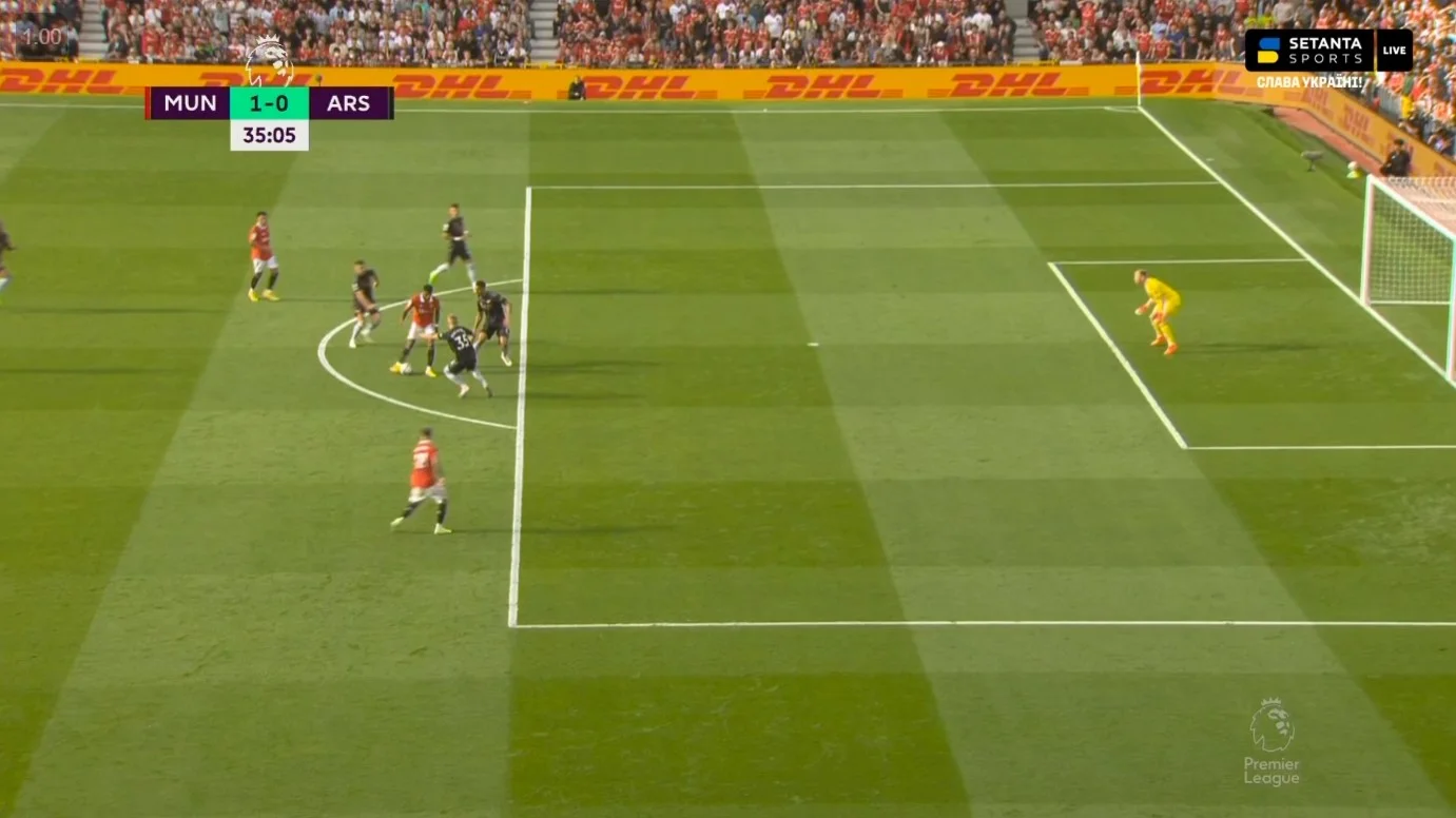 На время игра успокоилась, а потом команды обменялись ролями. Теперь Арсенал закрепился на чужой половине, выровнял владения и постоянно заходил в штрафную. Возникала угроза после стандартов. Лучший момент на этом этапе был у Мартинелли, но Де Хеа потянул мяч на линии. Болельщики увидели живой равный футбол, однако до перерыва ничья не сохранилась.