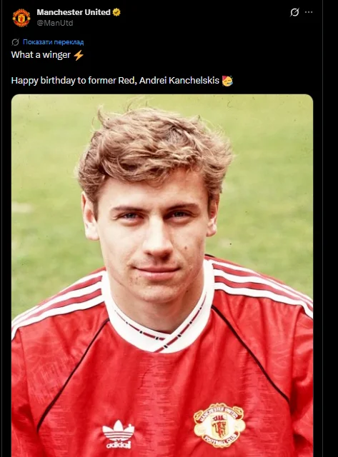 На аккаунте Манчестер Юнайтед в соцсети X появилось поздравление Андрея Канчельскиса с днем рождения.