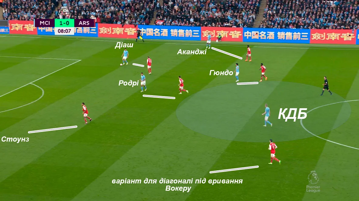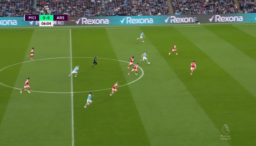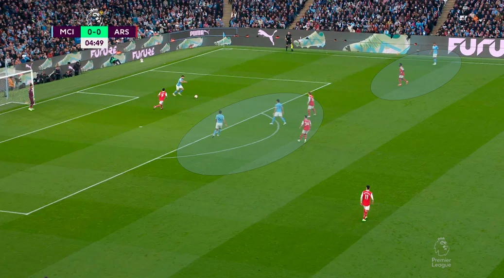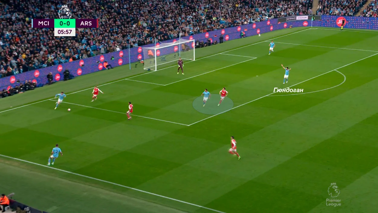 Арсенал попытался поджать Манчестер Сити, загнав "горожан" во фланг. Впрочем, Родри вытягивает за собой Джаку и оставляет свободным Гюндогана за спинами прессинг-группы.