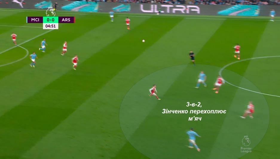Главные креативщики Арсенала вместо разрезных пасов на чужой половине вынуждены были помогать преодолевать бешеный прессинг Манчестер Сити. Как следствие, разрушилась магия треугольника на левом фланге Арсенала – игроки занимались не тем, чем должны были бы в стандартных условиях.