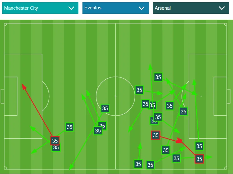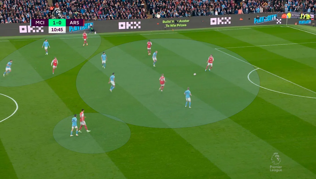 В матче на Эмирейтс "горожане" перевернули ход игры, включив чрезвычайно агрессивный прессинг. Арсенал склонен начинать билд-ап через обыгрыши, однако под натиском большой группы игроков начинались обрезки. На Этихаде ситуация повторилась – Манчестер Сити отказался от мяча, но оказывал колоссальное давление на билд-ап соперника.