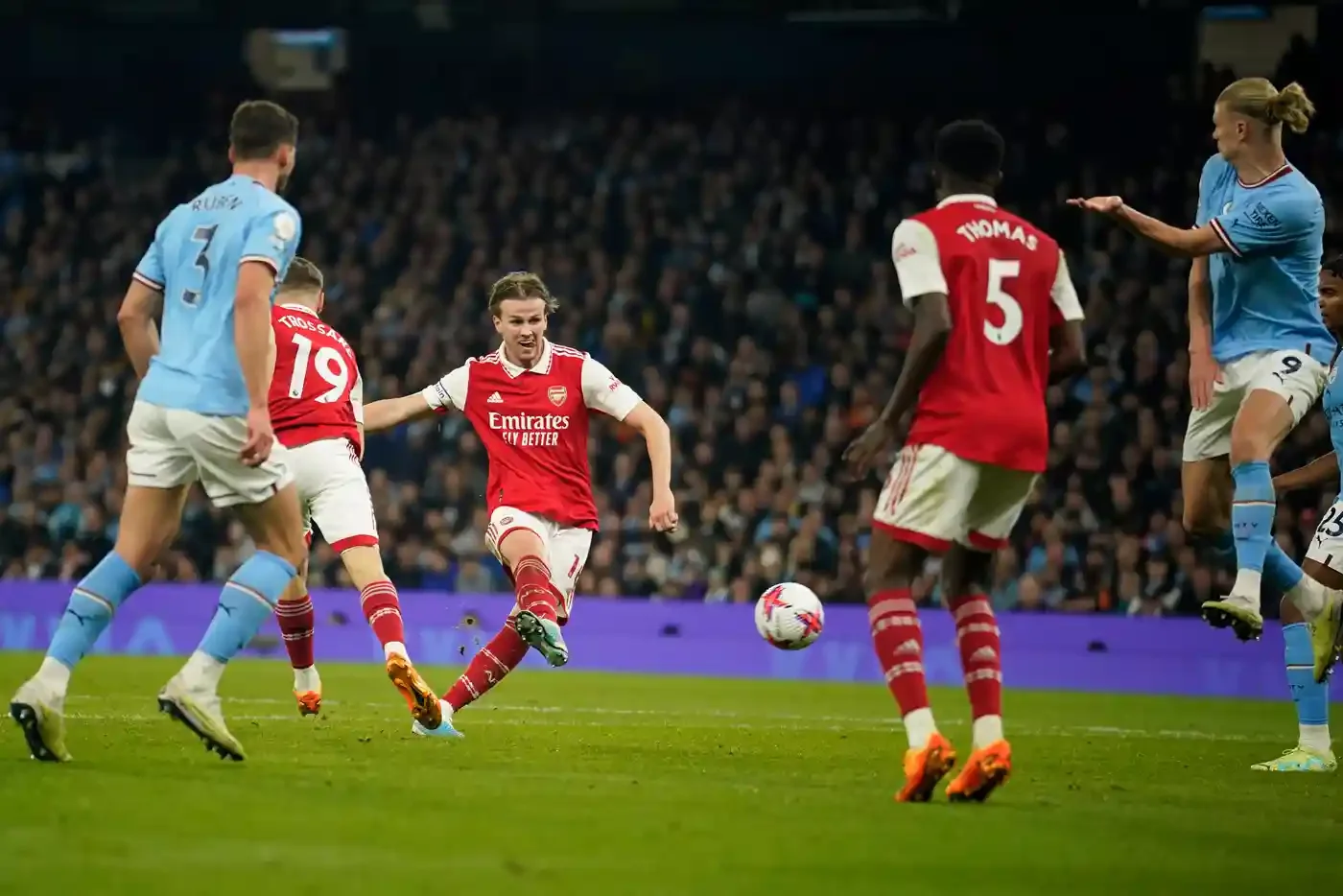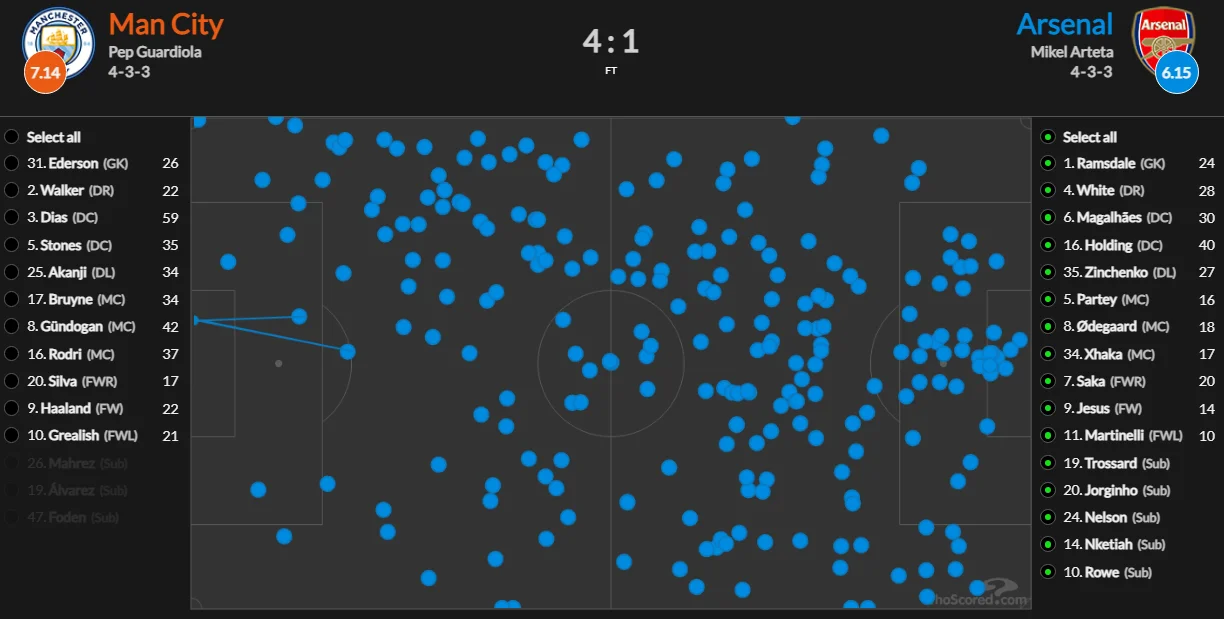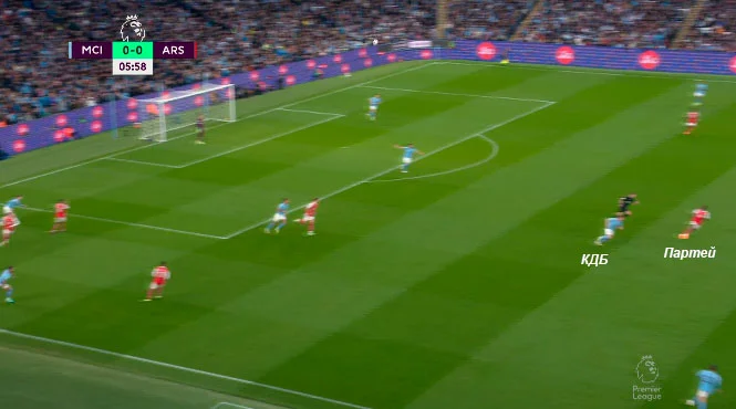 Впрочем, завершались такие ситуации невесело. Родри и Гюндоган своими опусканиями вытаскивали Джаку с Партеем на свою треть, а в разрыв между центрхавами и центрбеками Арсенала заходили Де Брюйне и Холанд.