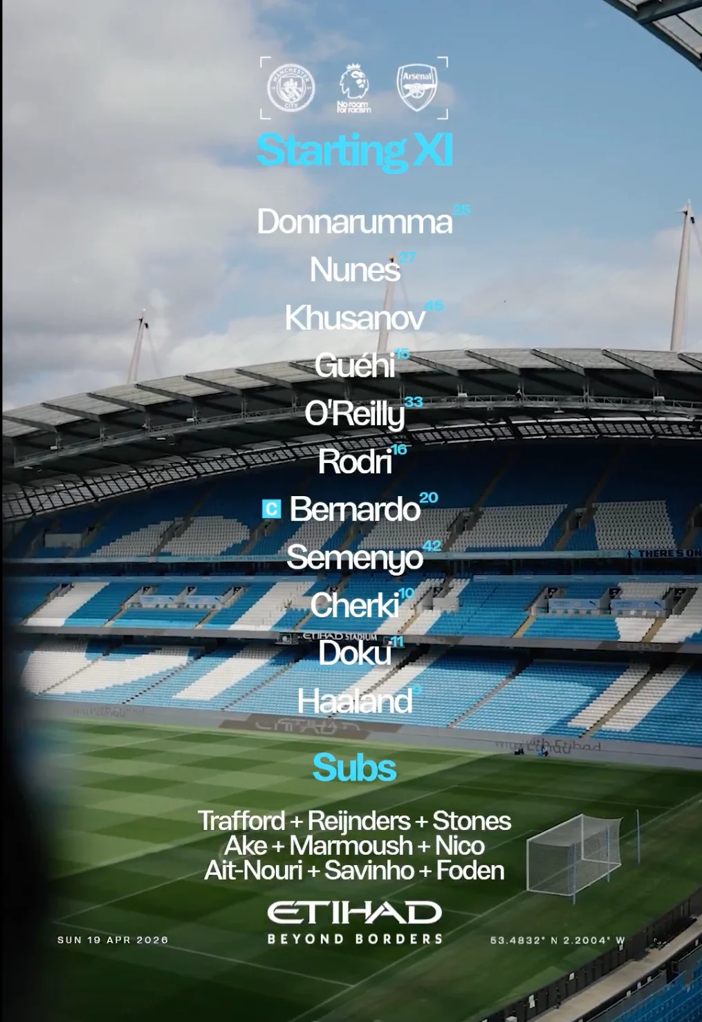 Манчестер Сити: Доннарумма, Нуньес, Хусанов, Гехи, О'Райли, Родри, Бернардо, Семеньо, Шерки, Доку, Холанд.