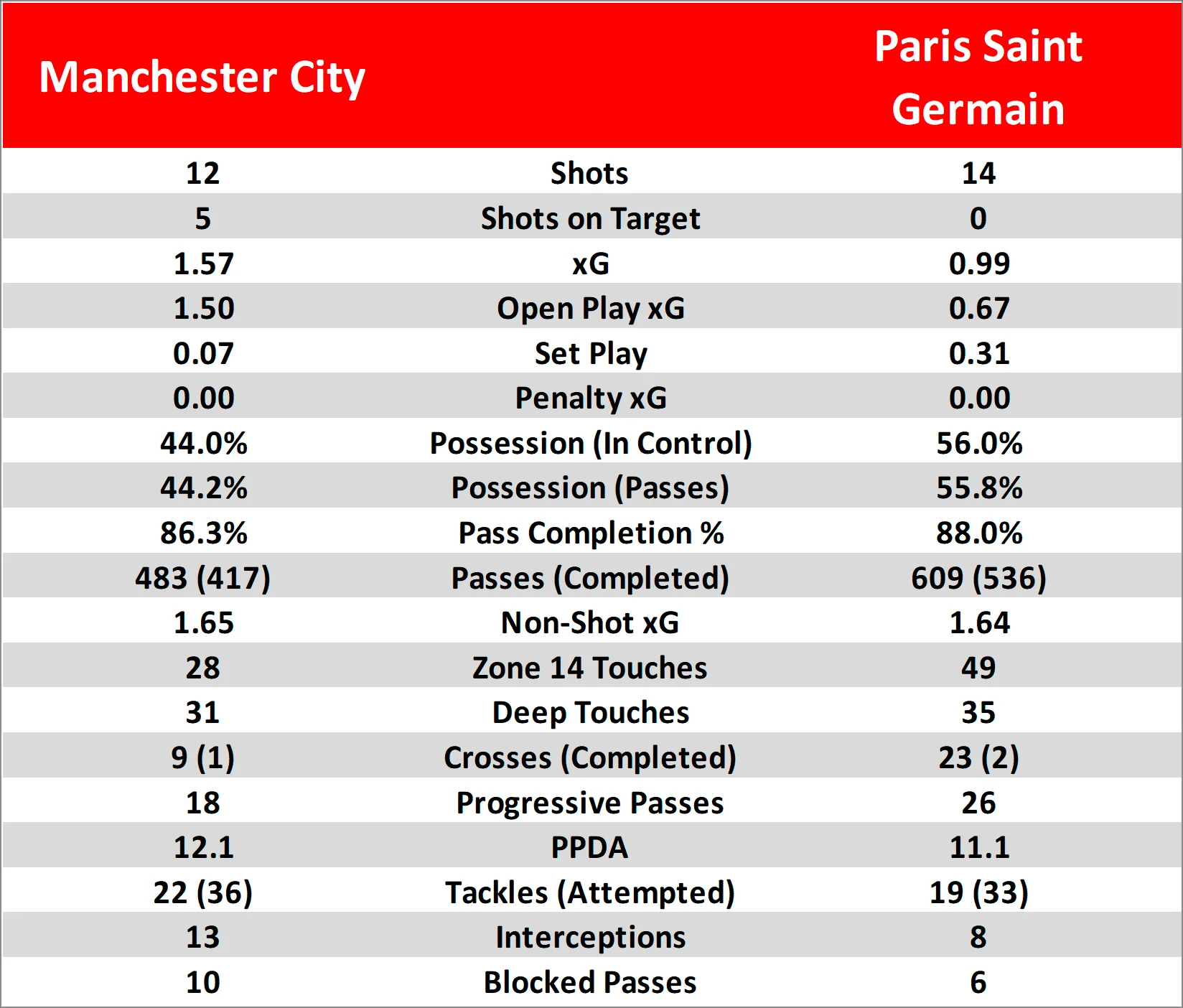 Это – нетипичная история для Манчестер Сити, но команда продемонстрировала готовность побеждать и таким образом. Оборона "горожан" просто уничтожила атаку ПСЖ: при равном количестве ударов (12:14) парижане выбили вдвое более низкий xG с игры (1,5 против 0,67). Это и неудивительно при отсутствии попаданий в створ и девяти заблокированных выстрелах.