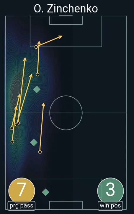 Александр находил свободное пространство после смещений в полуфланг. Самый показательный эпизод случился в середине второго тайма, когда Зинченко помог расшатать оборону, ворвался в коридор и создал супершанс для Ляпорта.