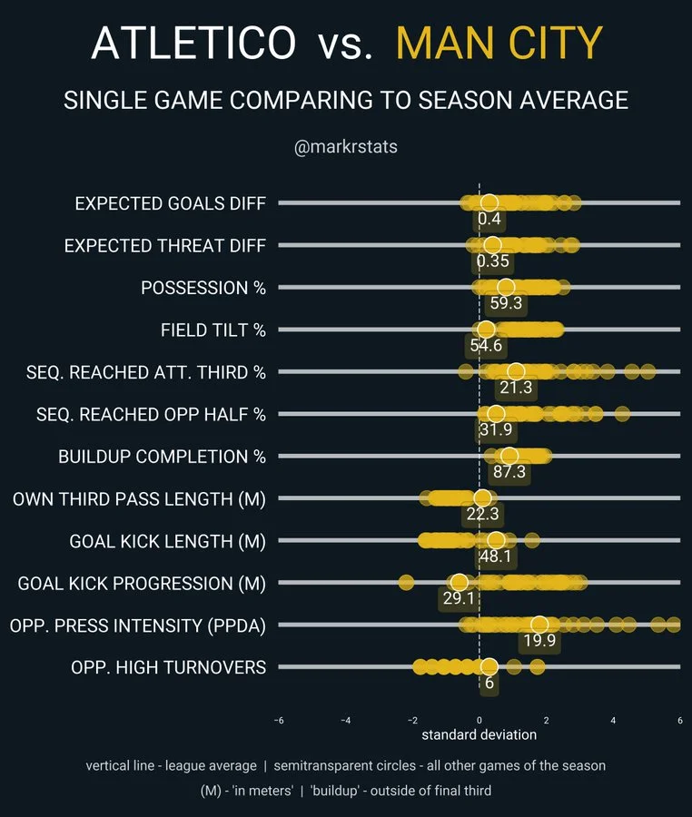 Как следствие – Манчестер Сити наиграл всего на 0,5 ожидаемых голов (без учета выхода один на один при игре 11 на 10), сделали лишь 25 касаний в штрафной (против 34-х у Атлетико) и выдали 0,87 xT (ожидаемая острота пасов). Что наиболее важно, гости создали всего 1 момент за 107 минут (до момента Гюндогана в эндшпиле).