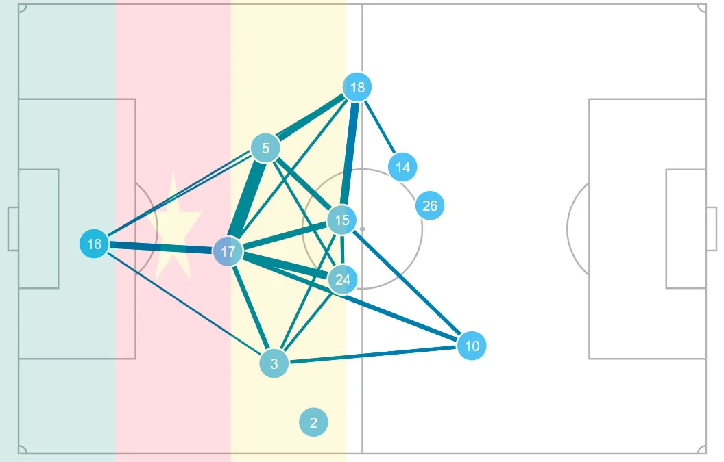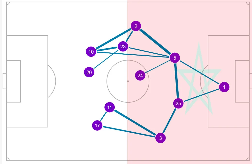 Карта пасов обеих сборных. У Марокко мало связей за центральным кругом, а самые активные каналы передач Камеруна – между центрбеками