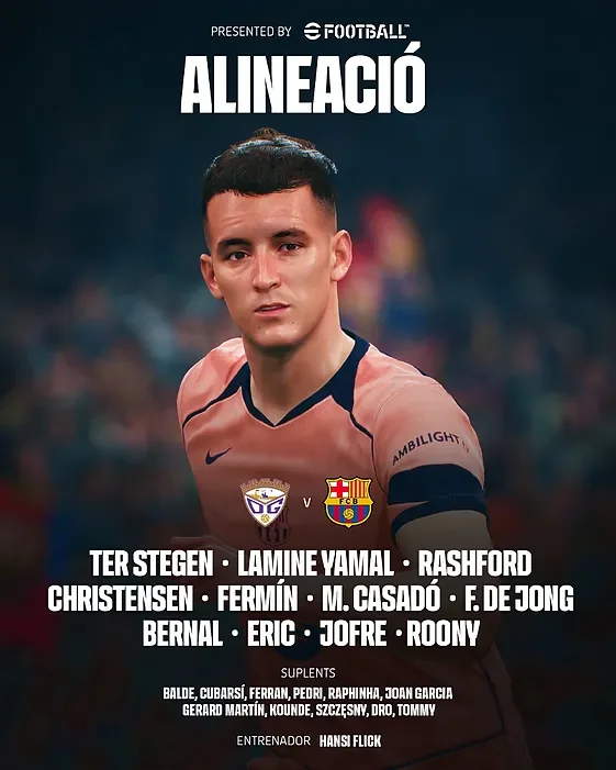 Состав Барселоны: тер Штеген, Касадо, Кристенсен, Эрик Гарсия, Жофре, Берналь, Френки де Йонг, Руни, Ламин Ямаль, Фермин, Рашфорд.