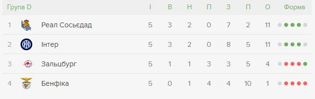 Реал Сосьедад и Интер досрочно вышли в 1/8 финала, а в последнем туре определят обладателя первого места. Обе команды имеют по 11 очков. Интеру нужно побеждать, ведь матч первого тура между этими командами в Испании завершился вничью, а общая разница голов лучше у Сосьедада. Поєтому все просто. Победа Интера – он первый. Ничья или победа Сосьедада – он лидер.
