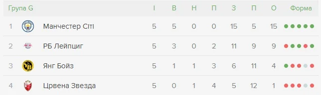 В этой группе абсолютно никакой интриги нет – турнирная таблица квартета G уже не претерпит изменений. Манчестер Сити досрочно обеспечил себе первое место. РБ Лейпциг при любых раскладах финиширует вторым. Янг Бойз будет играть в Лиге Европы, а Црвене Звезде не поможет уже ничего. Даже если сербы обыграют Манчестер Сити, а Янг Бойз проиграет Лейпцигу, то все равно у швейцарцев лучшие показатели в личных матчах (2:2, 2:0).