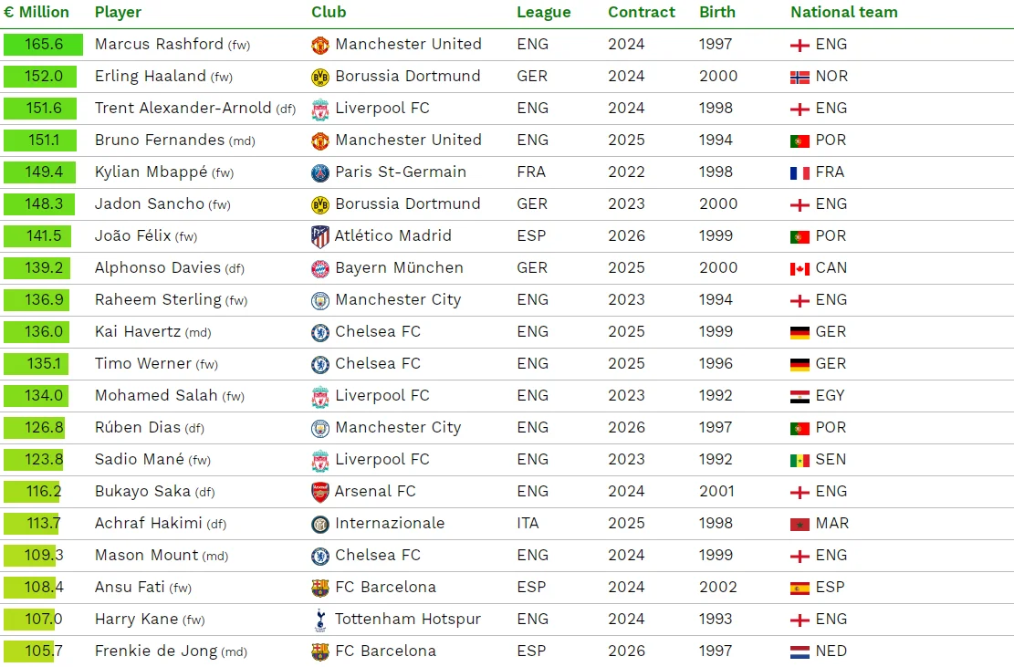 Сразу бросается в глаза смена лидера. Килиан Мбаппе из-за "короткого" соглашения с ПСЖ (до лета 2022-го) свалился с первой строчки на пятую (149,4 млн евро). На вершине теперь звезда Манчестер Юнайтед Маркус Рашфорд, которого оценили в 165,6 млн. В пятерку также попали Эрлинг Холанд (152 млн), Трент Александер-Арнольд (151,6 млн) и Бруну Фернандеш (151,1 млн).