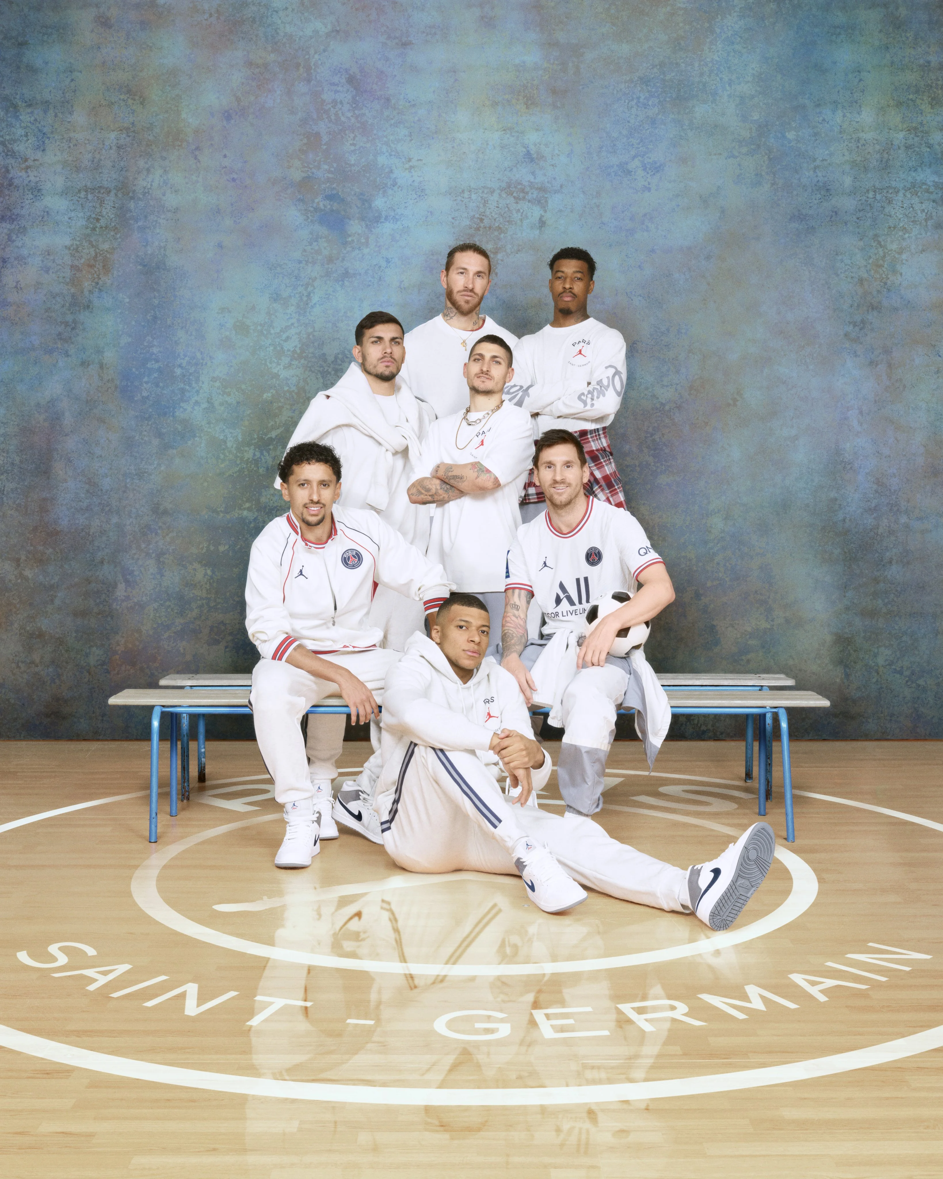 На некоторых изображениях у ног Месси есть серый квадрат с надписью "Jordan Paris Saint-Germain Spring 22". На другом можно увидеть, как Мбаппе, сидя на полу, вытянутой ногой закрывает бутсы своего партнера.