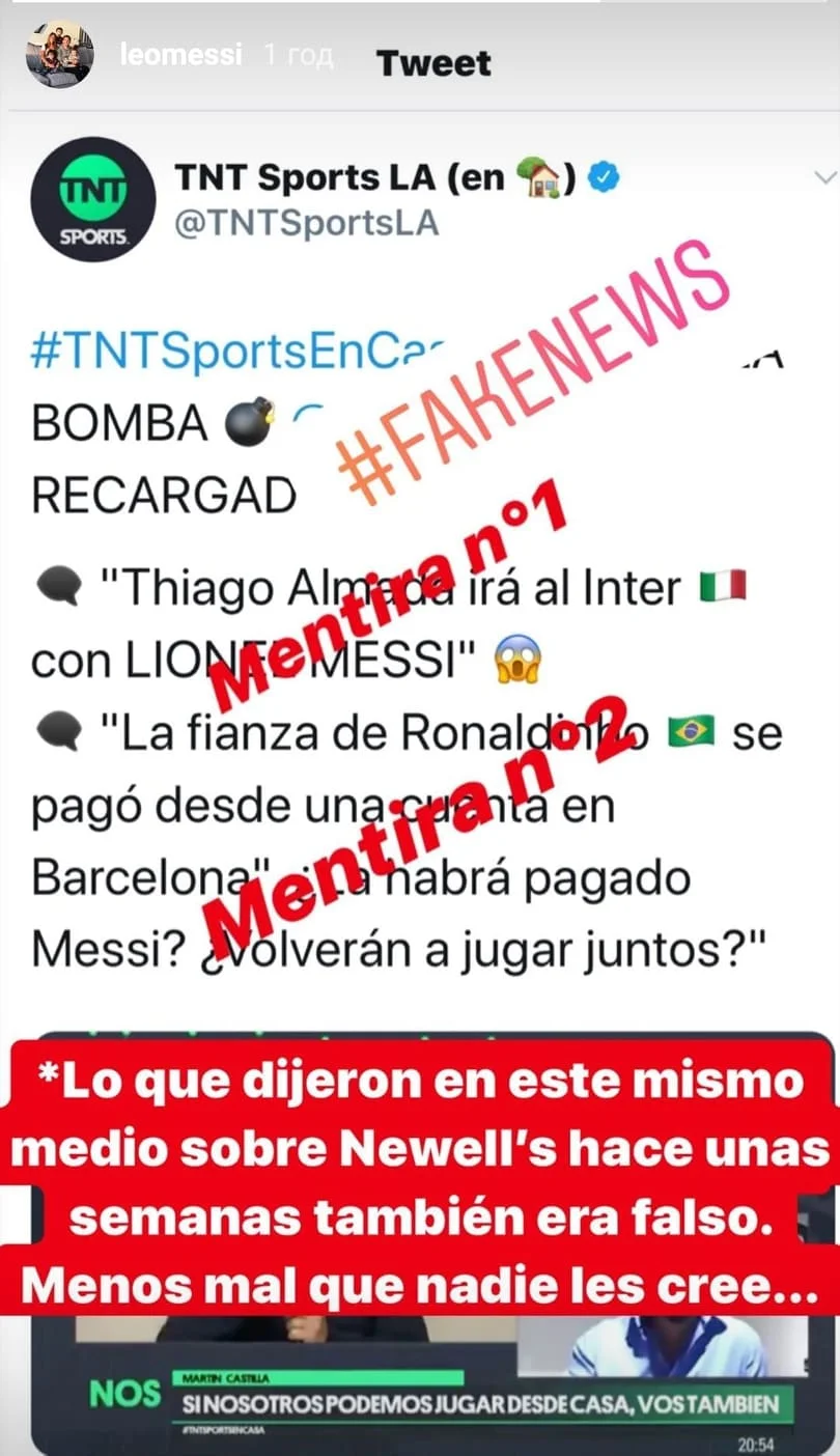 Месси жестко опроверг несколько новостей аргентинского TNT Sports, который целую неделю пиарился на его имени фейковой информацией. Лучший игрок планеты передал "горячий привет" любителям сенсаций через Инстаграм (147 млн подписчиков).