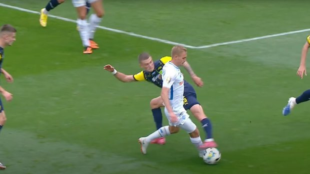 Неплохой прессинг хозяев. Михайленко сам перехватил, сам пробивал. Варакута неуверенно выставил руку, но круглый в сетку не залетел. Буяльский идет один против всех, Литвиненко делает подножку. Копиевский и судьи на VAR считают, что это не пенальти. Странно. За похожий момент на Пихаленку назначили 11-метровый в игре против Александрии, и Риццоли подтвердил правильность вердикта. Буяльский просто One Man Show выдает – после наброса Караваева божественный удар через себя, будто в пляжном футболе родом из Копакабаны, но Варакута отменяет шедевр не менее крутым сейвом.