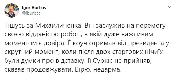 Тренер получил ее от президента в трудный момент, когда после двух стартовых ничьих были мысли об отставке. Суркис не принял ее, сказав продолжать", – поделился Бурбас в своем твиттере.