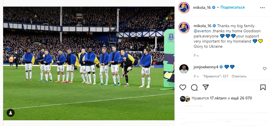 "Спасибо моей большой семье Эвертона, спасибо моему родному стадиону Гудисон Парк, всем – ваша поддержка очень важна для моей Родины. Слава Украине!" – написал Миколенко на своей странице в социальной сети Instagram.
