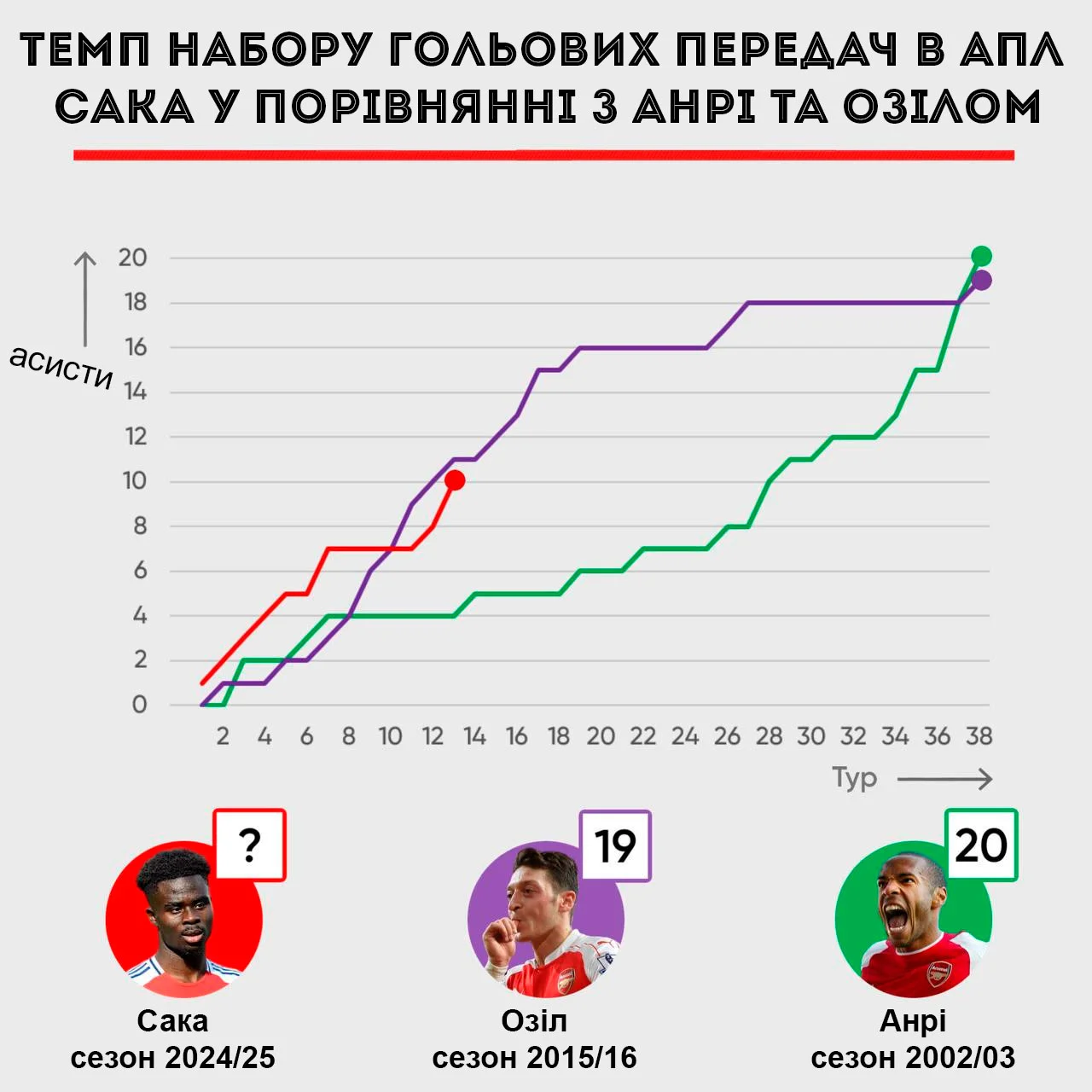 Букайо является лучшим в составе по системе гол+пас (5+10) и имеет больше предударных действий (89). Именно он выполняет угловые с правого флажка, а его темп раздачи голевых передач позволял побить вечный рекорд Анри.