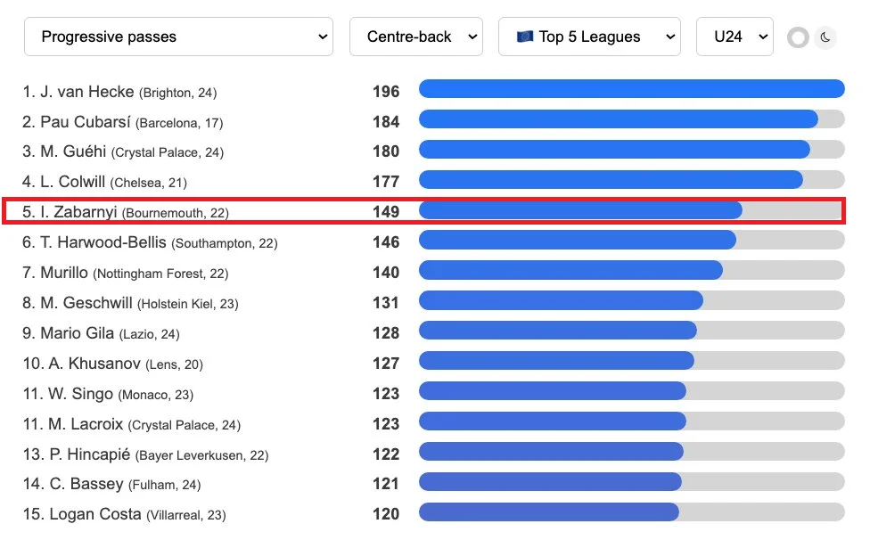 Значительную роль в этом успехе играет Забарный. По количеству пасов с продвижением Илья входит в топ-5 центрбеков – и не в АПЛ, а в топ-5 лигах Европы среди ЦЗ в возрасте до 24 лет.