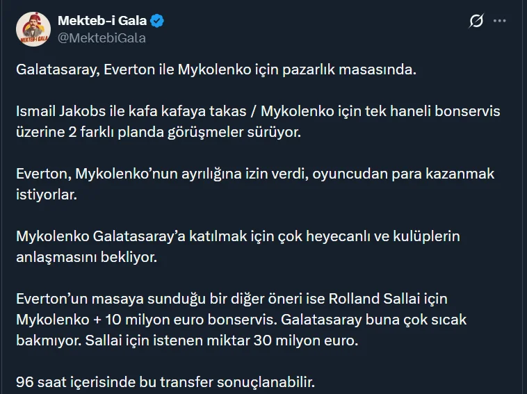 Отмечается, что есть несколько вариантов сделки. Галатасарай может обменять Исмаила Якобса на украинца, или же Эвертон отдаст турецкому клубу Миколенко добавив 10 миллионов евро, а получат Роллана Саллаи. Впрочем, этот вариант не устраивает Галатасарай, поскольку Саллаи не хотят отпускать дешевле, чем 30 млн евро.