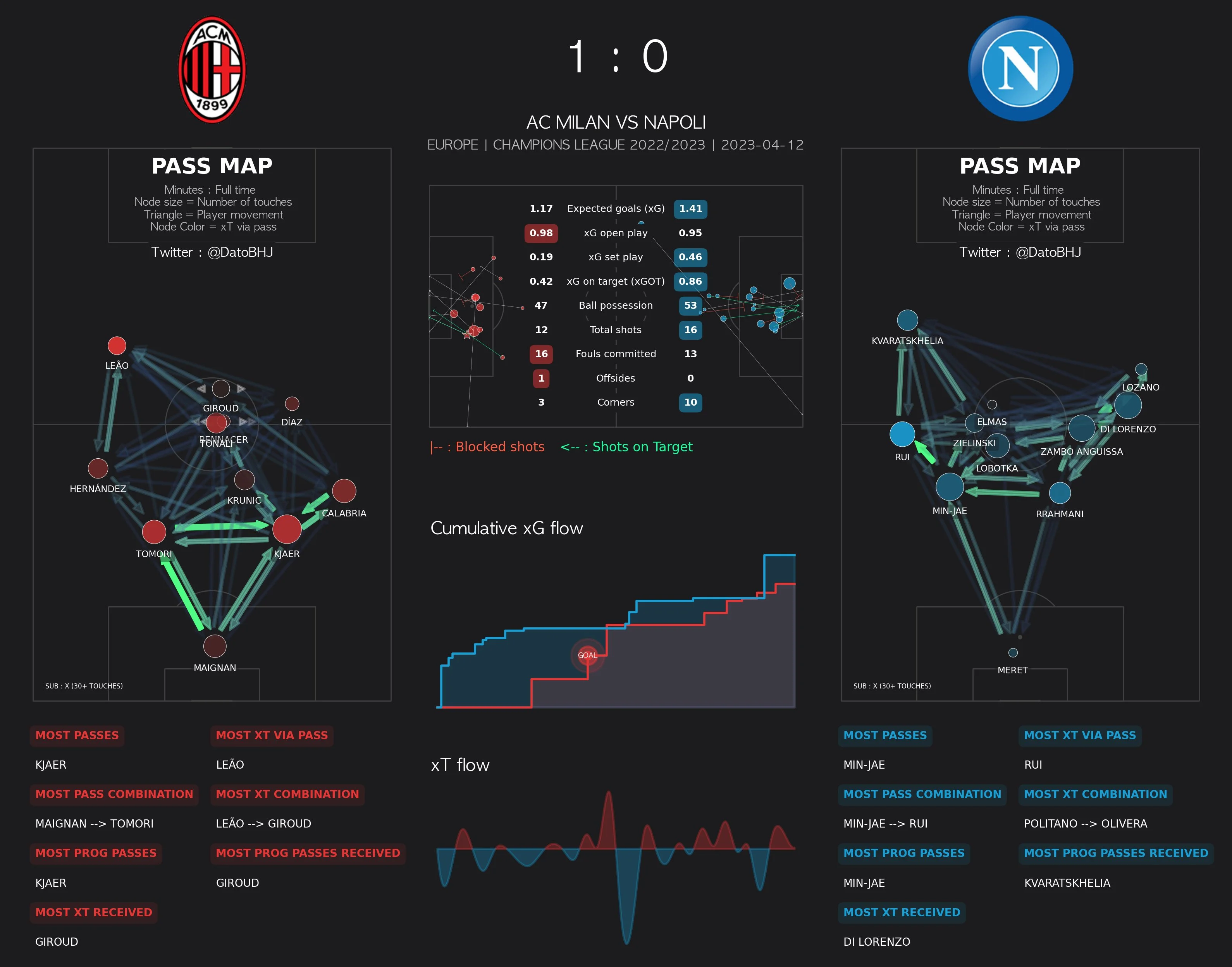 Милан выстоял под этим давлением и сумел изменить картину матча. Леау и Диас начали помогать проходить прессинг, опускаясь глубже за мячом. Это имело два последствия: Наполи реже отбирал на чужой половине (ни одного удара до конца тайма), а Милан получил варианты для собственных атак. Моменты возникали тогда, когда Диас и Леау, благодаря дриблингу или скорости, проскакивали оппонентов.