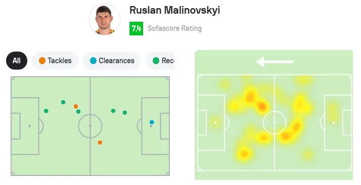 Попытки отбора, выносы и возвращения мяча (слева) и тепловая карта Малиновского