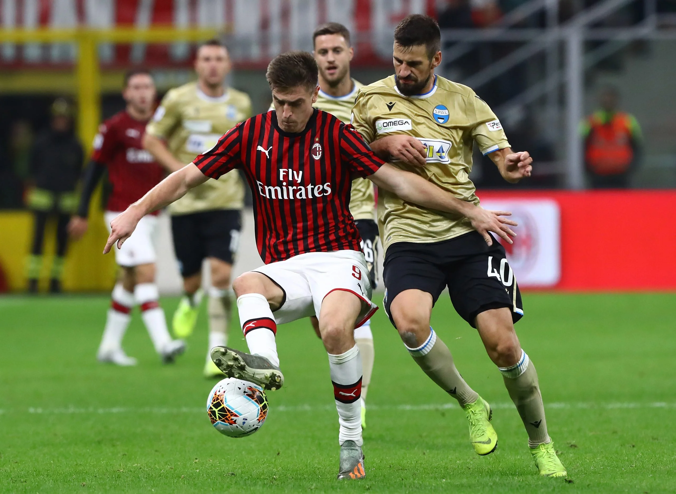 Территориальное преимущество "россонери" воплотилась в быстрый забитый мяч. На 20-й минуте Беннасер вывел на свидание с голкипером Кшиштофа Пйонтека, а польский форвард раз доказал, что такие возможности не теряет – удар в противоход Берише и 1:0. Под занавес первой половины игры Милан удвоил свое преимущество, а бомбардир выступил в роли ассистента. Пйонтек собрал на себе всю оборону феррарцев, а затем сбросил направо на Саму Кастильехо. Испанский вингер немного подработал мяч и элегантно забросил его в дальнюю девятку гостей.