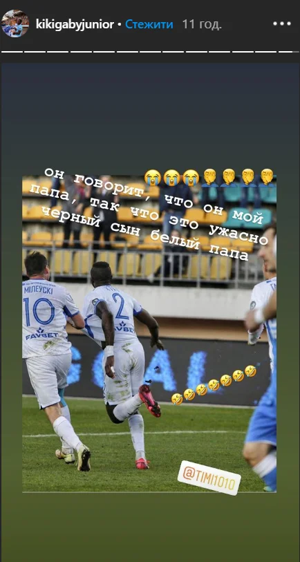 Кики в Instagram опубликовал фотографию, на которой вместе с Милевским празднует гол в ворота Ислочи. "Он говорит, что он мой папа, это ужасно – черный сын и белый папа", – написал африканец под фотографией.