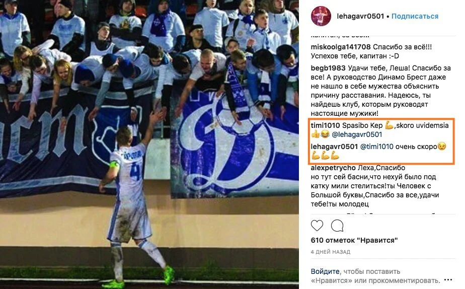 Алексей Гаврилович, который вместе с Милевским покинул Динамо Брест, в Инстаграме поблагодарил свой уже экс-клуб. Милевский в комментарии написал фразу: "Скоро увидимся", на что Гаврилович ответил: "Очень скоро".