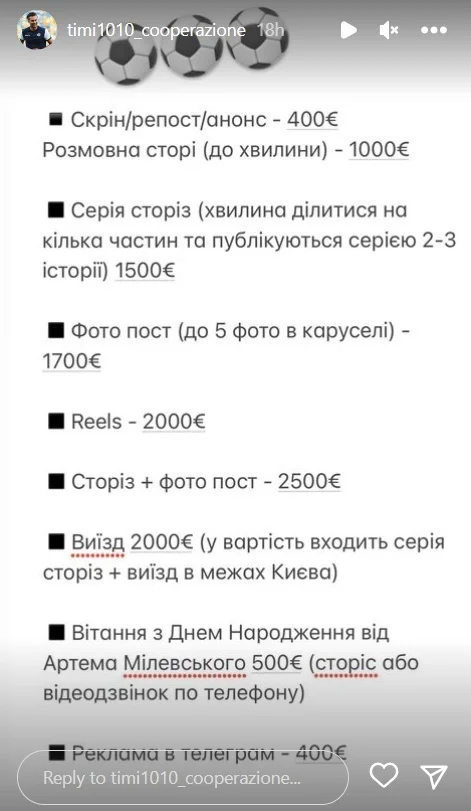 Милевский готов предоставлять всевозможные услуги – фото, сториз, поздравления с Днем рождения и даже личный выезд. Правда, за это придется выложить немалые деньги. Сколько это стоит? Артем за свои труды рассчитывает получить от 400 до 2500 евро. В частности, выезд в пределах Киева стоит 2 тысячи евро.