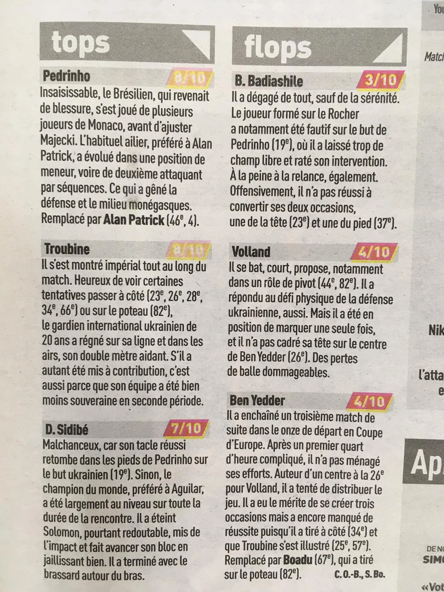У Монако лучше всех сыграл Джибриль Сидибе – 7 баллов от L'Équipe. Центрбек Бенуа Бадиашиль с "тройкой" признан худшим игроком матча. Ряд монегасков и тренер Нико Ковач получили 4. Влияние Роберто Де Дзерби оценили на 6 баллов.