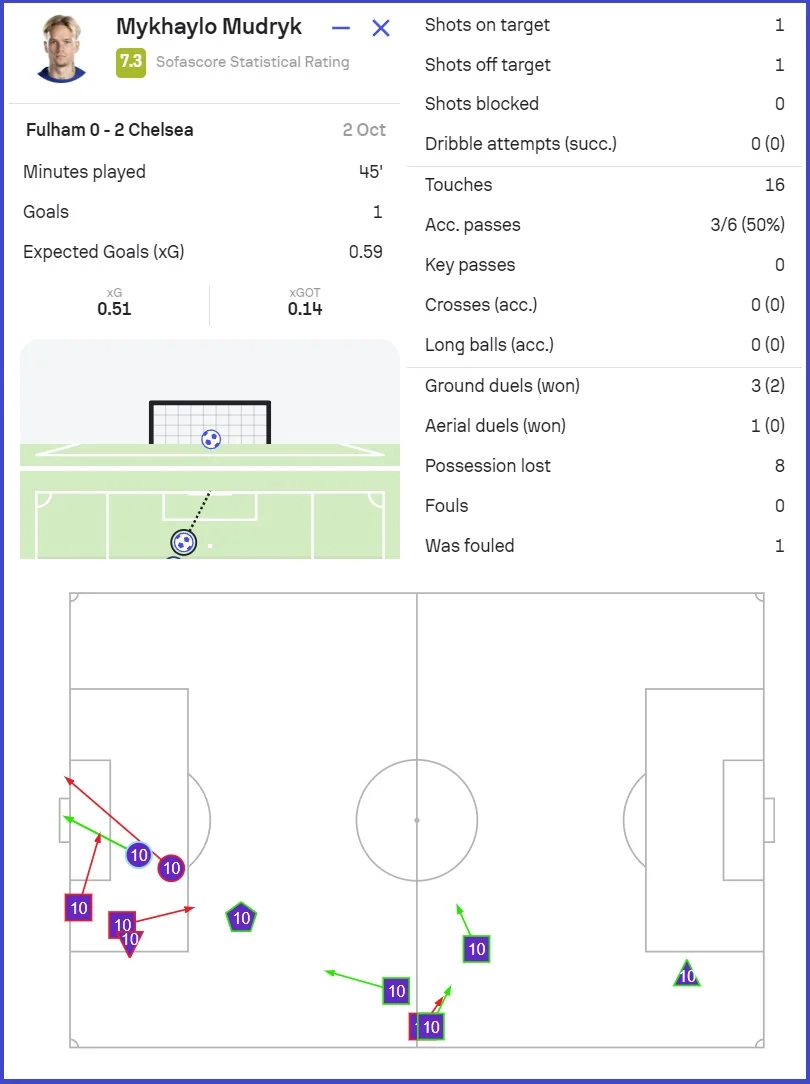 Не следует думать, что Мудрик выдал настоящую феерию. Нет. В первом тайме Михаил во многом напоминал себя привычного – принимал мяч на прямых ногах, позволял играть через свою зону в центре и допускал много потерь (8 при 16 касаниях). Вместе с тем, украинец не был инертным в борьбе, выиграв 2 единоборства из трех и исполнив один удачный отбор.