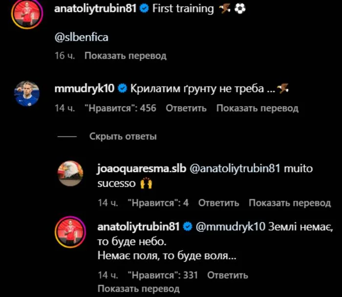 "Крилатим грунту не треба", – написал вингер Челси. Трубин не остался в долгу и продолжил поэтический флешмоб: "Землі немає, то буде небо. Нема поля, то буде воля...".
