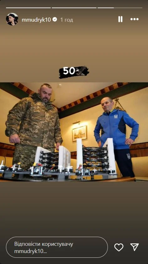 Мудрик в своем Instagram опубликовал фото дронов, подписав его цифрой "50". Позже Михаил подтвердил Tribuna, что передал эти дроны военным.