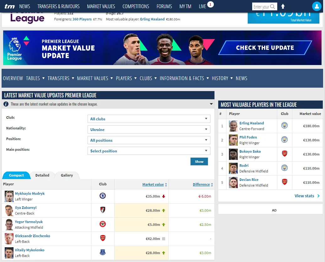 Самая дорогая футбольная лига мира получила 128 новых рыночных оценок, увеличив свою общую стоимость на 240 млн – до 11,09 млрд евро. Сыграли свою роль в этом обновлении и трое представителей Украины.
