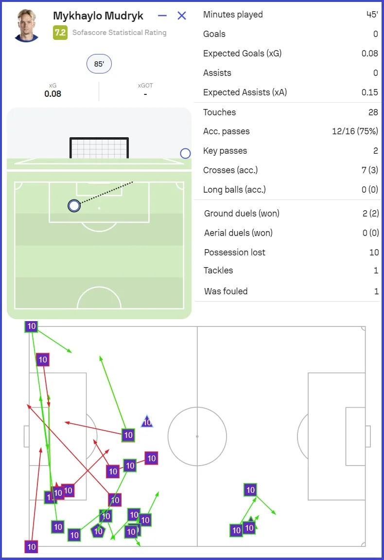Дважды украинец пытался пробить по воротам. Оба раза вышло очень неудачно: сначала поскользнулся, потом пальнул по воробьям. В активности Мудрику не откажешь – в конце матча его перемещение помогло выйти на удар Мадуэке (парировал голкипер). Оценки статистических порталов: SofaScore – 7.2, WhoScored – 6.3.