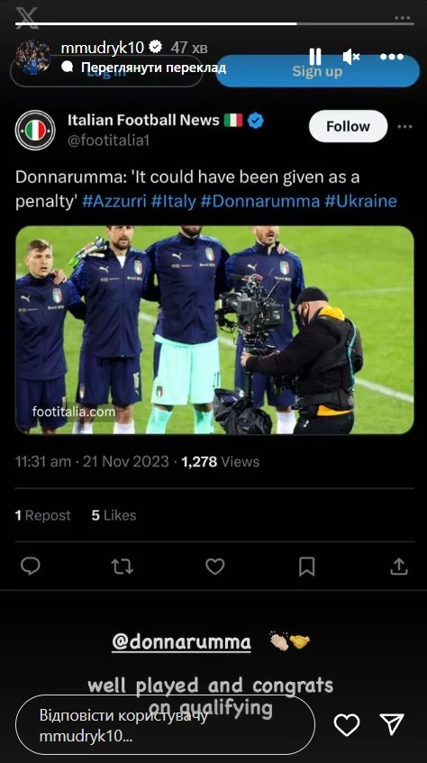 Украинец в своем Instagram выложил скриншот с комментарием итальянца, дописав: "Хорошо сыграл. Поздравляю с выходом на Евро", и добавил эмодзи аплодисментов.