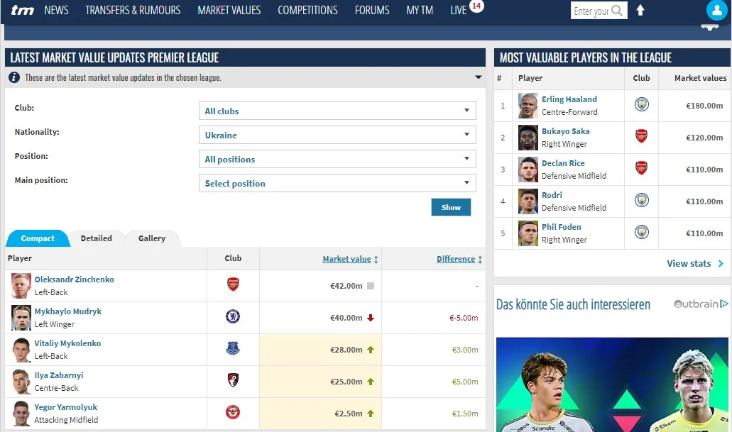 Специалисты портала Transfermarkt обнародовали очередные изменения ценников украинских футболистов, выступающих в чемпионате Англии.