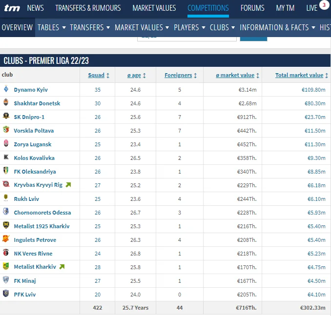 Общая тансферная стоимость всех футболистов УПЛ составляет 302,33 миллиона евро. Самым дорогим украинским клубом является Динамо – его человеческие активы оценивают в 109,8 млн. Второе место занимает Шахтер – 80,3 млн. Замыкает тройку СК Днепр-1 – 23,7 млн евро. Значительно отстает за этим показателем Минай (4,5 млн) и Львов (4,1 млн).
