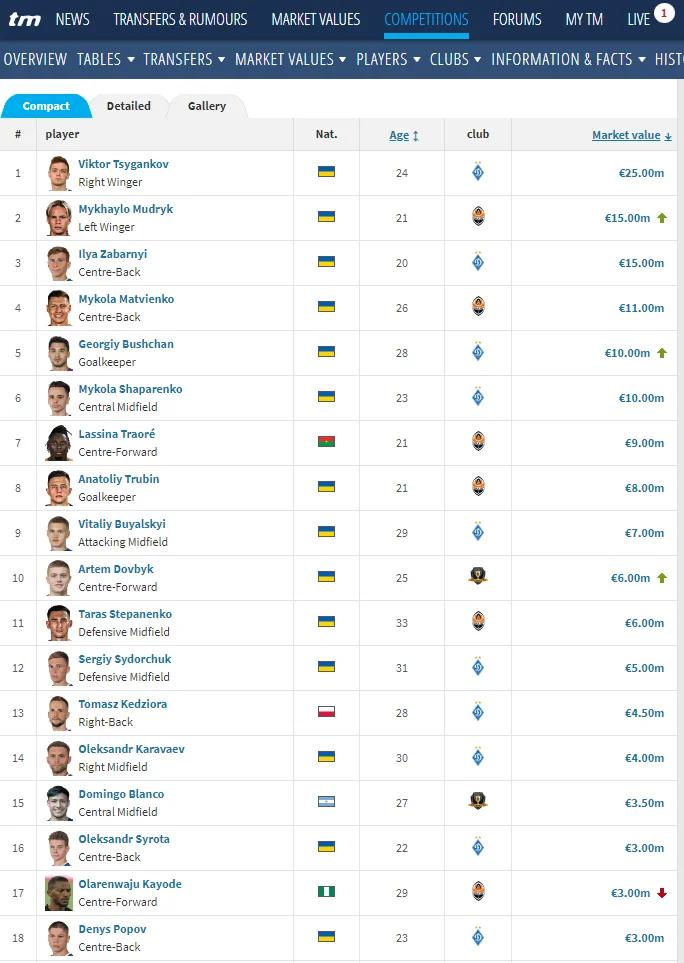 Самые дорогие футболисты УПЛ по версии Transfermarkt: