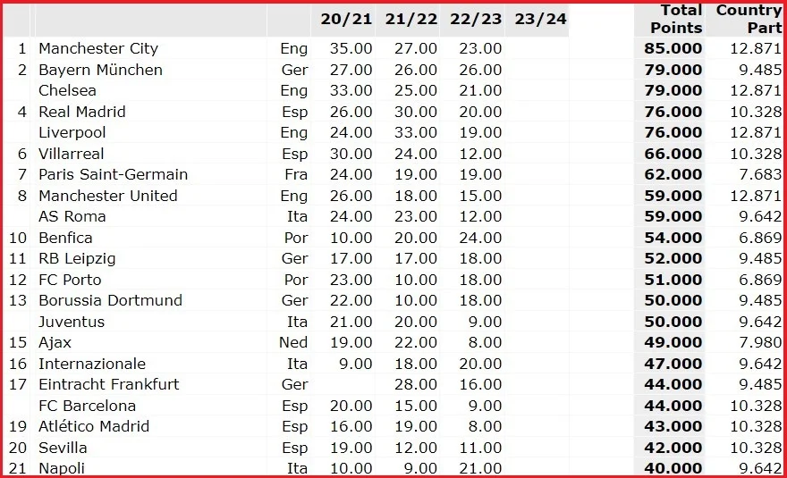 Возьмем клубный рейтинг УЕФА (начиная как раз с сезона 2020-21) и попробуем смоделировать участников ЧМ-2025 от Европы (кроме Челси и Реала). Очевидно, что за полтора сезона ситуация еще может измениться, но примерную картину увидим.