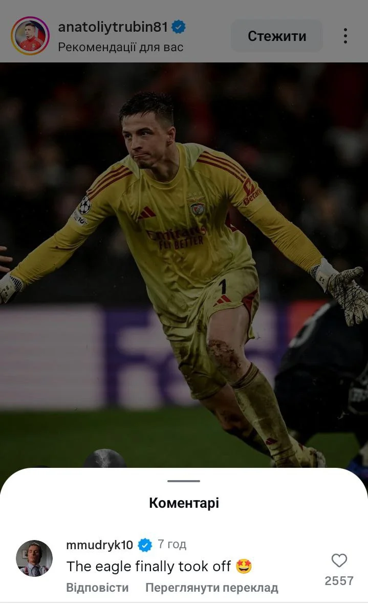 Вингер Челси Михаил Мудрик отреагировал на безумное взятие ворот, сделав комментарий под постом Трубина в Instargam.