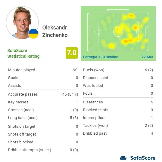 Преимущественно действовал в непривычной для себя среде – без мяча, но при этом не потерялся, остановив вместе с партнерами Криштиану Роналду и других звездных португальцев. Несмотря на позицию центрхава, вчера Зинченко львиную долю игрового времени проводил на своей половине. Он записал себе в актив 2 удачных отбора, 1 перехват, 5 выноса 3 заблокированных удара.