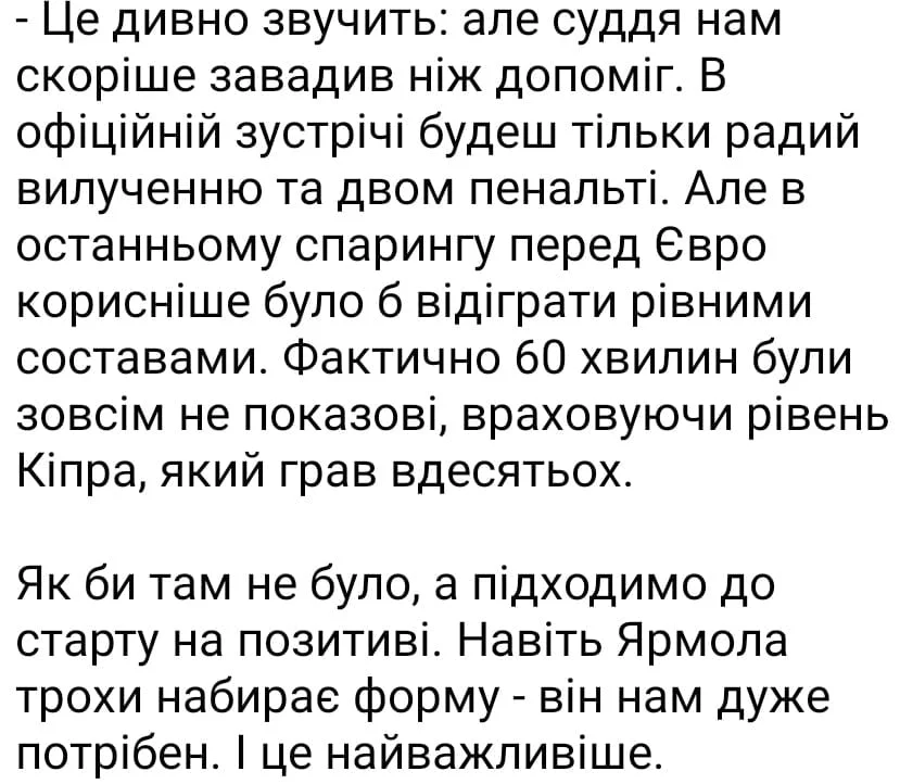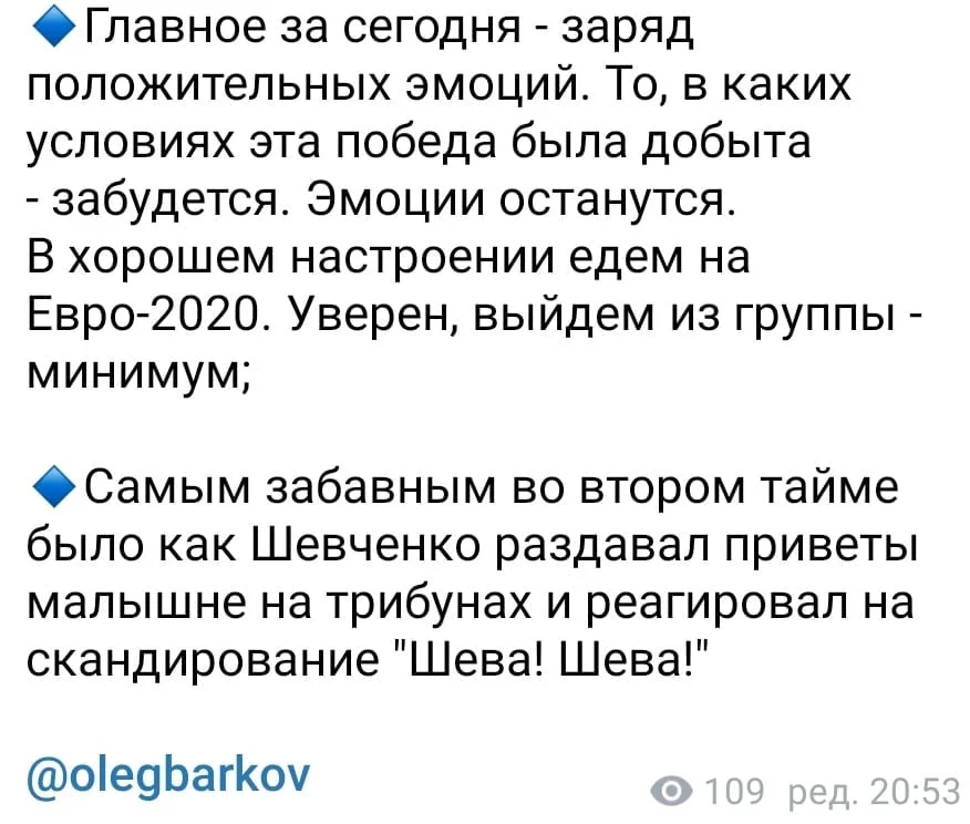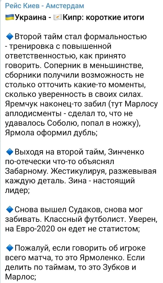 Журналист Олег Барков в своем Telegram сделал несколько кратких выводов по горячим следам. Главный месседж: Украина должна выходить из группы на Евро, а Зинченко – лидер.
