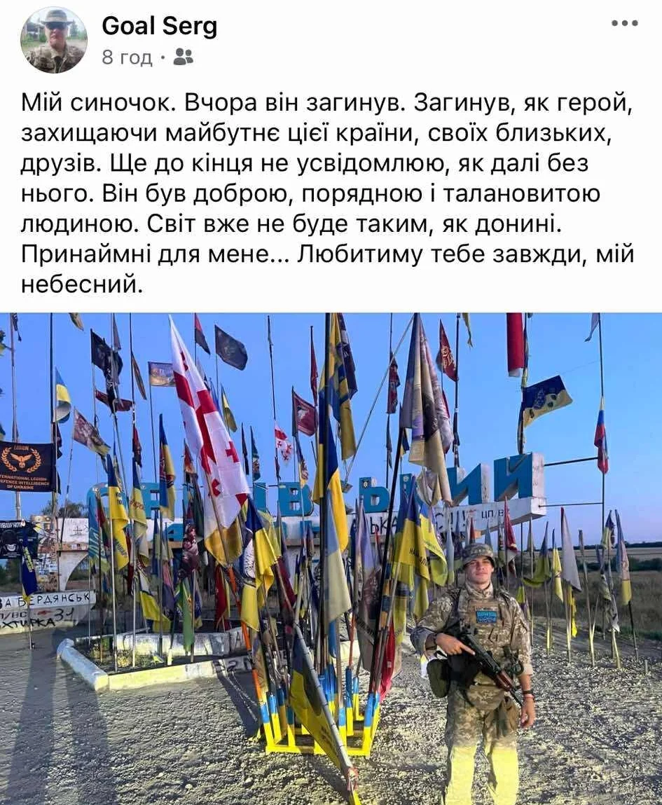 “Мой сыночек. Вчера он погиб. Погиб, как герой, защищая будущее этой страны, своих близких, друзей. Еще до конца не осознаю, как жить дальше без него. Он был добрым, порядочным и талантливым человеком.