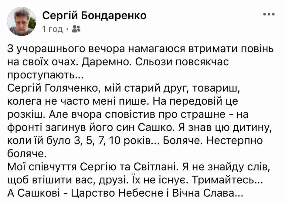 "Со вчерашнего вечера пытаюсь удержать наводнение на своих глазах. Напрасно. Слезы постоянно проступают. Сергей Голяченко, мой старый друг, товарищ, коллега не часто мне пишет. На передовой это роскошь. Но вчера сообщил о страшном – на фронте погиб его сын Саша. Я знал этого ребенка, когда ему было 3, 5, 7, 10 лет... Больно. Невыносимо больно. Мои соболезнования Сергею и Светлане. Я не найду слов, чтобы утешить вас, друзья. Их не существует. Держитесь... А Саше – Царство Небесное и Вечная Слава!" – написал Бондаренко в Facebook.