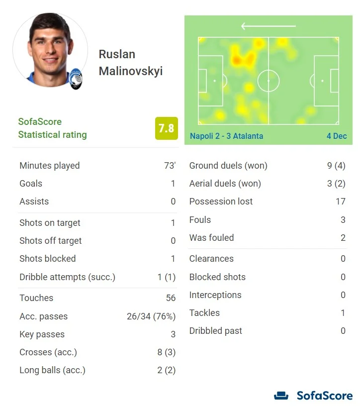 Малиновский – лучший игрок матча по оценкам SofaScore (7.8). Вполне заслуженно. Руслан был самым острым в составе гостей и отыграл сегодня продуктивно. Он отлично исполнял стандарты, а стандартов у Аталанты было много. Две подачи украинца завершились опасными ударами Демираля головой – оба раза мяч полетел над перекладиной.